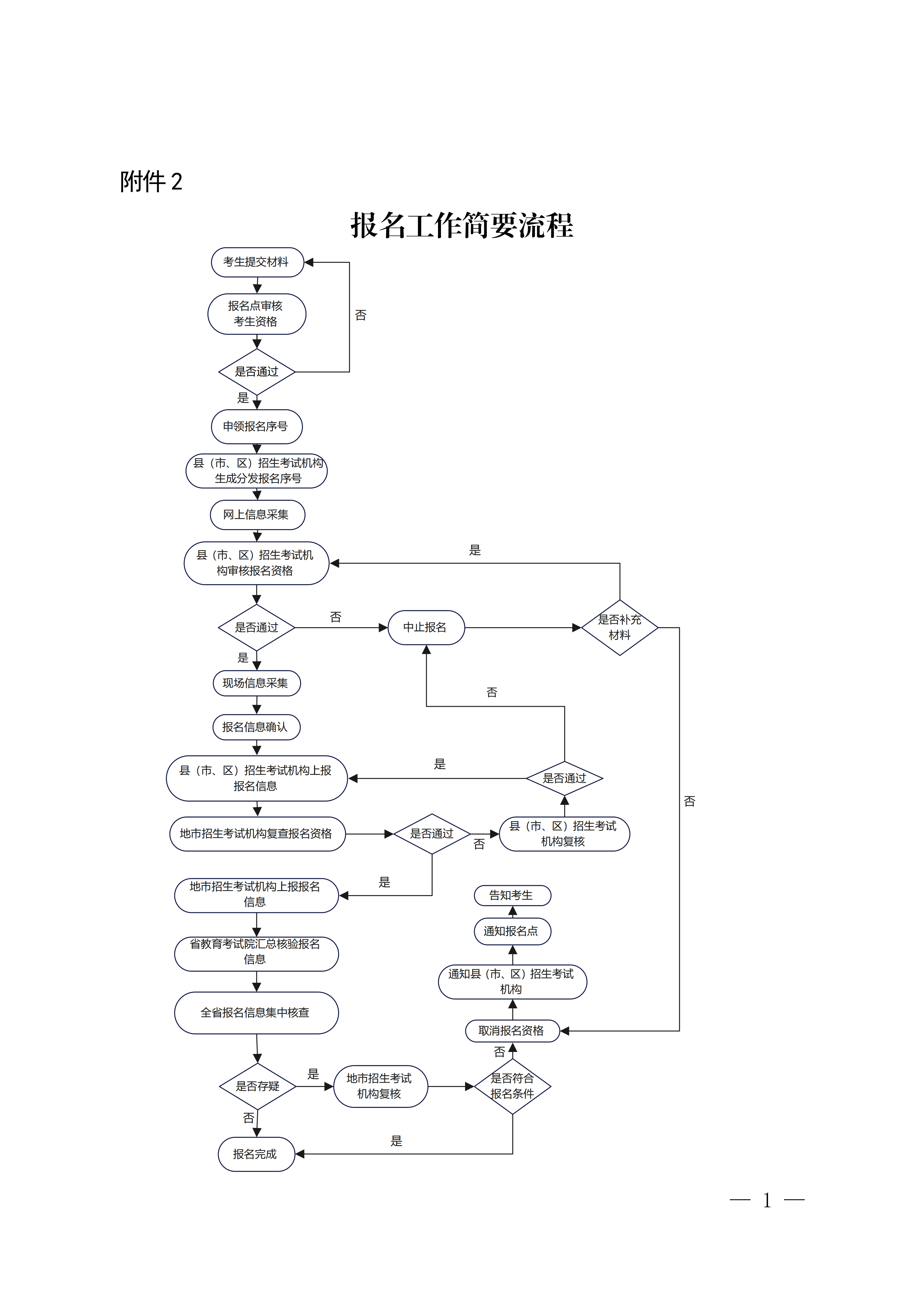 答:报名工作程序包括报名资格初审、生成分发报名序号、网上信息采集、现场信息采集、报名信息确认、报名信息汇总核验等环节(报名工作简要流程见附件2)。