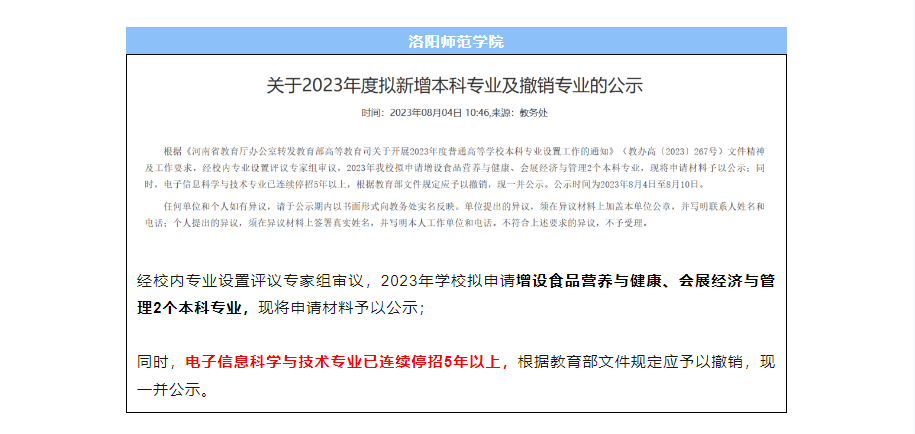 《通知》中提到,普通高等学校新增本科专业、第二学士学位专业、调整专业学位授予门类或修业年限、拟撤销专业等,将在7月17日—8月31日集中进行备案或审批申请。