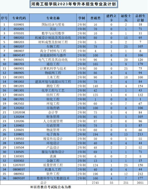 2023年河南工程学院专升本专业招生,涵盖了工学、理学、经济学、管理学、艺术学等六大学科门类的36个普通专业,学制均为两年制,专升本招生计划为3051人(其中包括普通类2745人,建档立卡55人,退役士兵251人)。详情参见上图,大家可以截图保存。