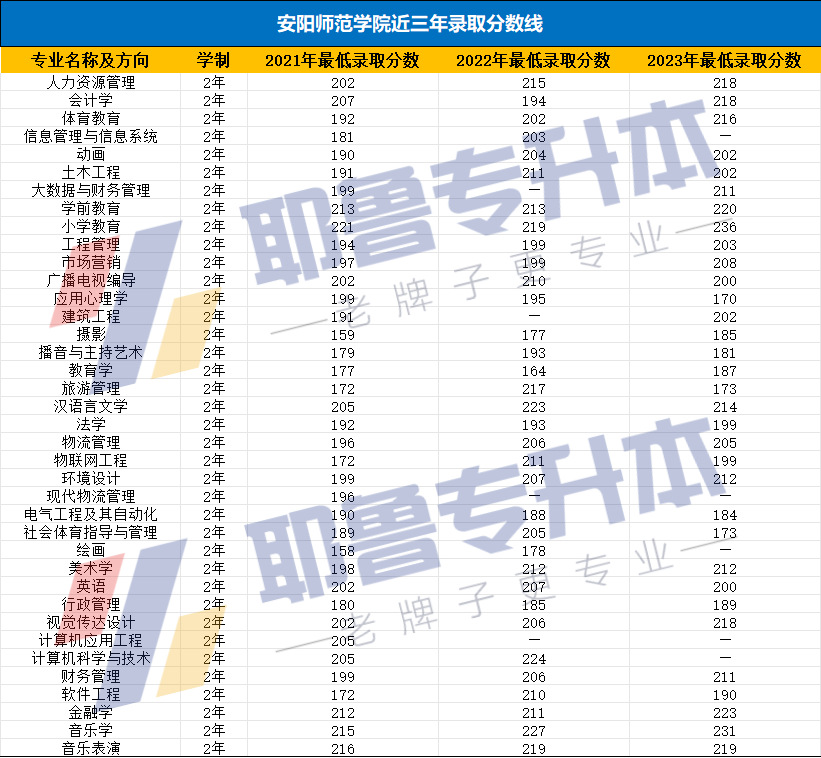 当然从以上数据可能并不能直观的看到自己分数能否成功上岸安阳师范学院,于是耶鲁专升本给各位准本科生整理了近三年的录取分数线,希望能够帮助到大家。